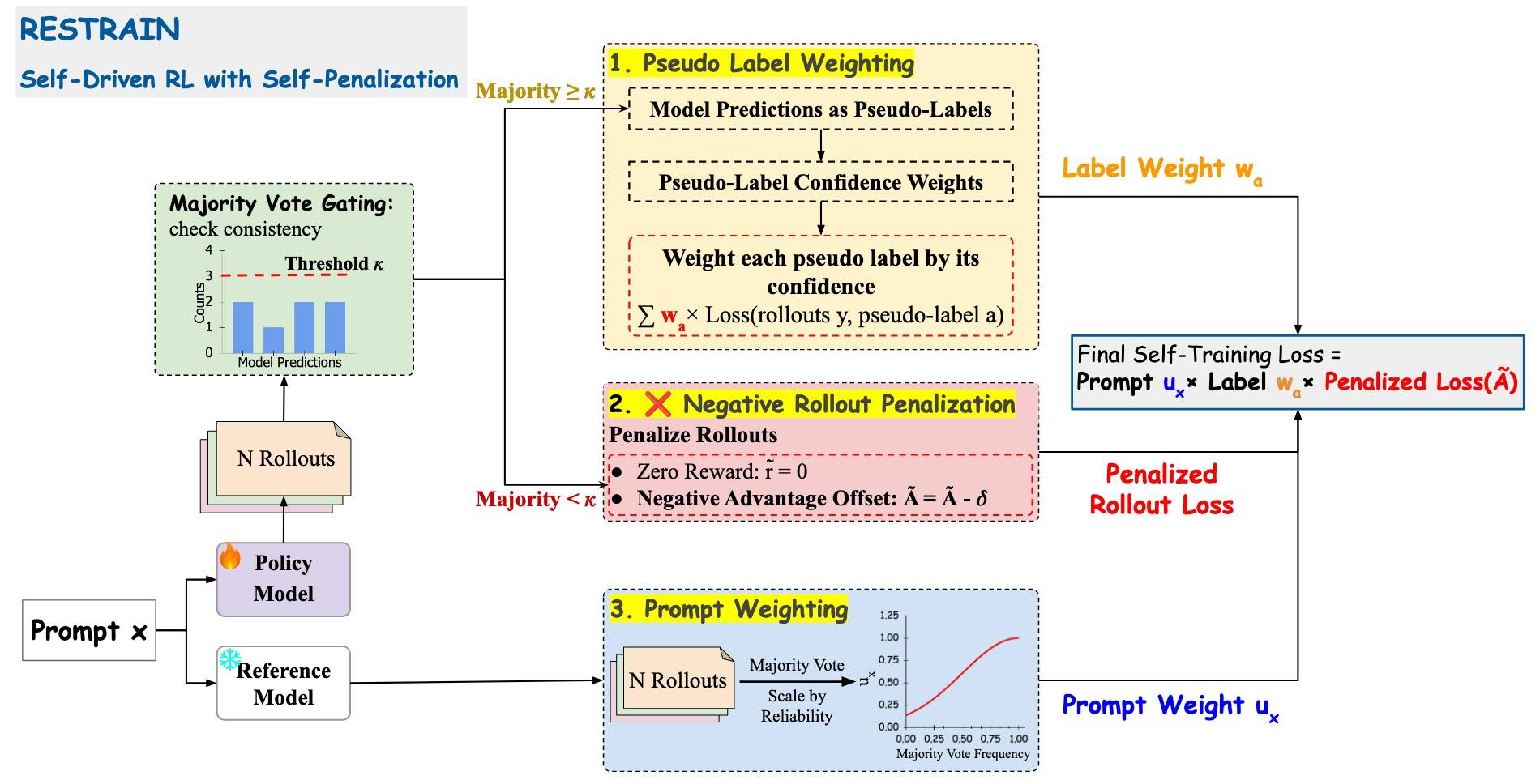 • RESTRAIN 利用全部 rollout 信号,对低一致性与过度自信样本进行系统性惩罚。