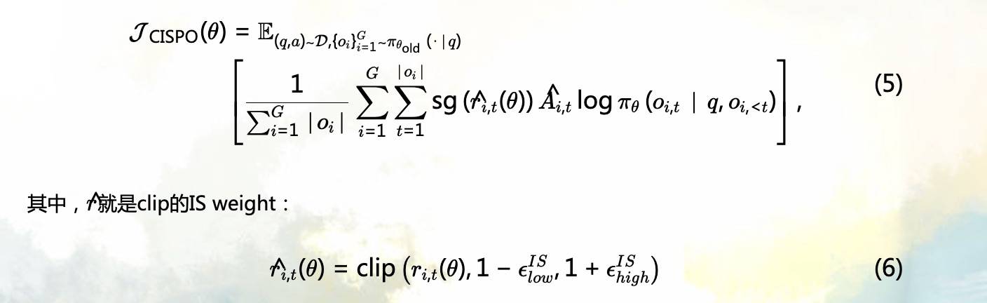 CISPO 我们此前在 GRPO优化在继续——CISPO和熵 | 长琴[2] 中专门介绍过,也是观察到 GRPO 中的不当 clip 可能会将关键推理 token 剪掉,导致无法参与后续梯度更新。因此,CISPO 被设计为明确避免丢弃 token,即使是那些对应较大更新的 token,同时通过内在机制将熵控制在合理范围内,以确保探索过程的稳定性。损失函数如下(直接截博客图了):