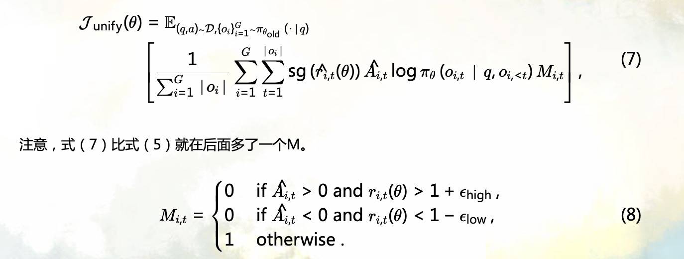 • 借鉴 MiniMax M1 的 CISPO[4],采用了带截断重要性采样的 off-policy 梯度目标