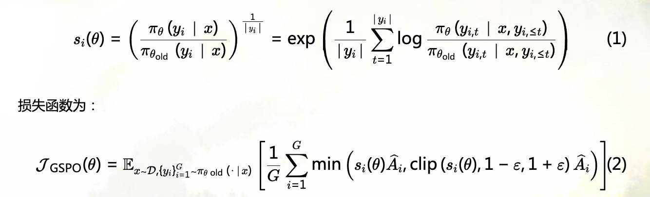 GSPO 引入了长度归一化,目的是解决 token 级别的重要性权重计算方式在训练中引入的高方差噪声。因此,重要性权重的单位应该和奖励的单位一致,都是序列级别的。损失函数设计如下(还是直接截博客图):