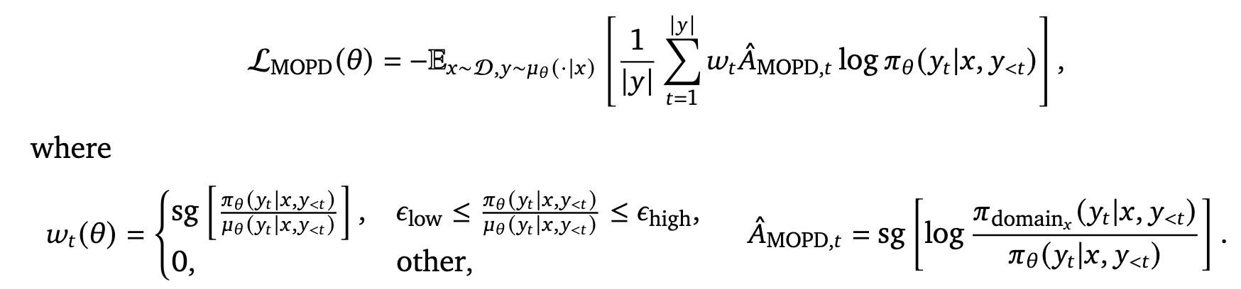 A^MOPD,t=sg[logπdomainx(ytx,y<t)πθ(ytx,y<t)]+αA^ORM.\hat{A}_{\mathrm{MOPD}, t}=\operatorname{sg}\left[\log \frac{\pi_{\operatorname{domain}_x}\left(y_t \mid x, y_{\lt t}\right)}{\pi_\theta\left(y_t \mid x, y_{\lt t}\right)}\right]+\alpha \hat{A}_{\mathrm{ORM}} .