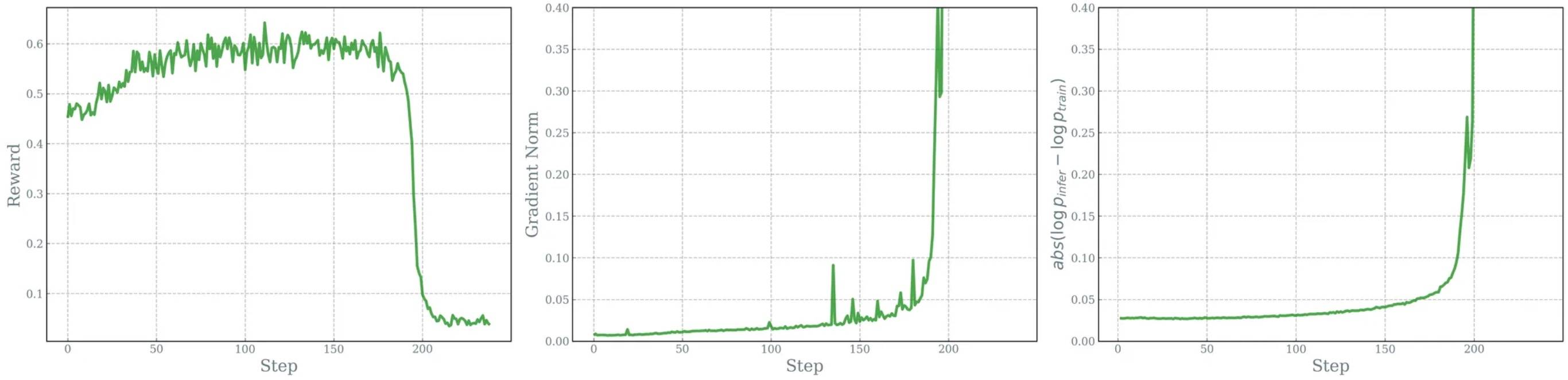 以上现象表明,MoE 模型在训练与推理阶段之间存在显著更高程度的分布差异。而这种差异会让训练不稳定,甚至崩溃。比如 IcePop[2] 给出的现象,如下图所示: