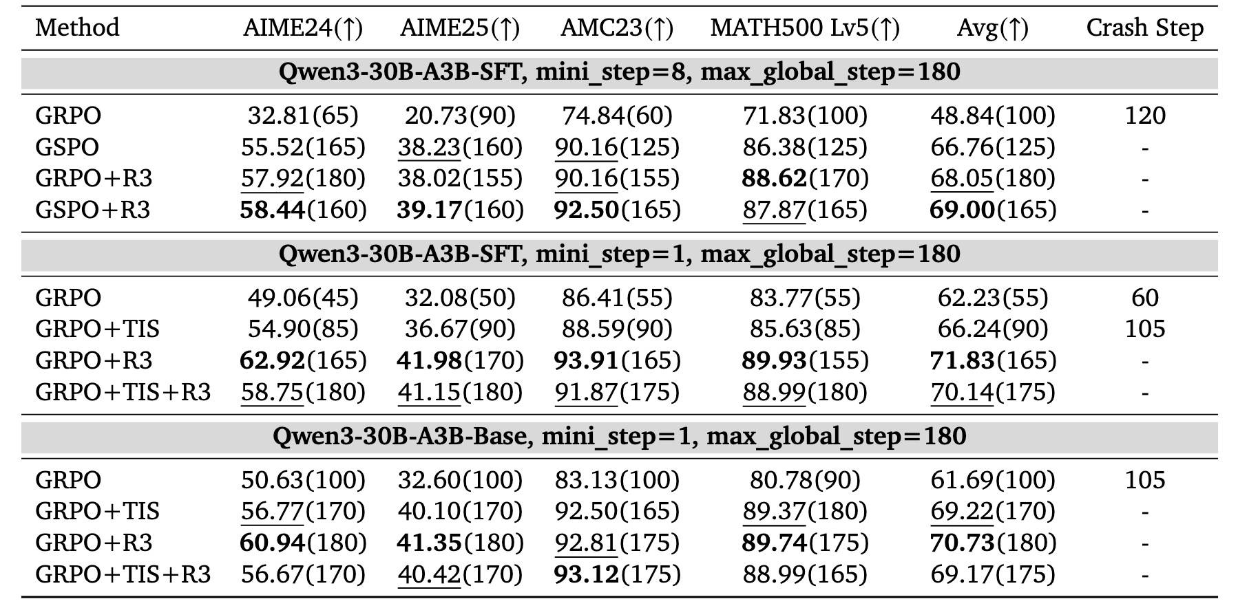 括号里的是最佳步数。看起来 GRPO + R3 好像就可以了。