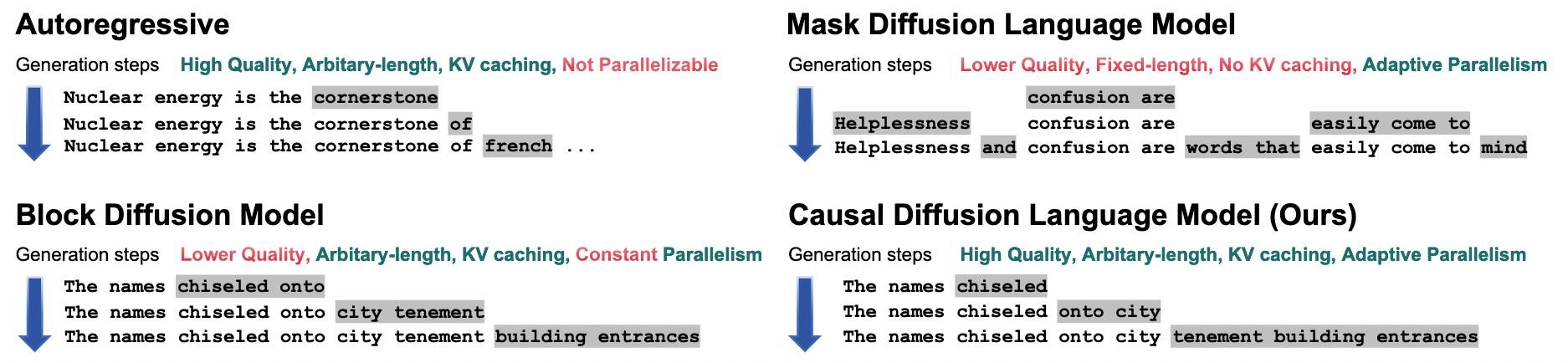 要说 DLM,就不得不先说 ARM 的局限性:错误累积、缺乏全局结构的前瞻性、因果瓶颈(模型无法根据后续上下文对已生成的 token 进行修正);而全局结构的前瞻能力和迭代精炼能力正是 DLM 的优势所在。