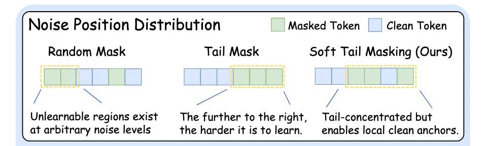 注意,Strict Tail 设置中,序列末尾是一整块连续噪声区域;Relaxed Window 则在尾部窗口内允许干净 token 与噪声 token 混合;Random 则是整个序列随机,没有尾部 mask。
