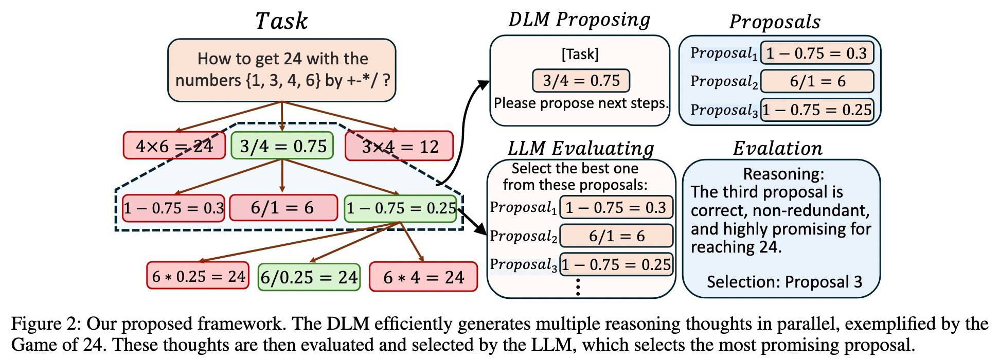 不同于《2402 Diffusion of Thoughts: Chain-of-Thought Reasoning in Diffusion Language Models[18]》的纯 Diffusion CoT,《2510 Diffuse Thinking: Exploring Diffusion Language Models as Efficient Thought Proposers for Reasoning[19]》用 DLM 生成多样化的推理候选方案,然后利用 ARM 输入处理高效(输出成本较高)和语义理解能力较强的特点,评估和筛选中间推理结果。DLM 与 ARM 的协作是在完整“推理思维”层展开,形成协同增益的共推理范式。