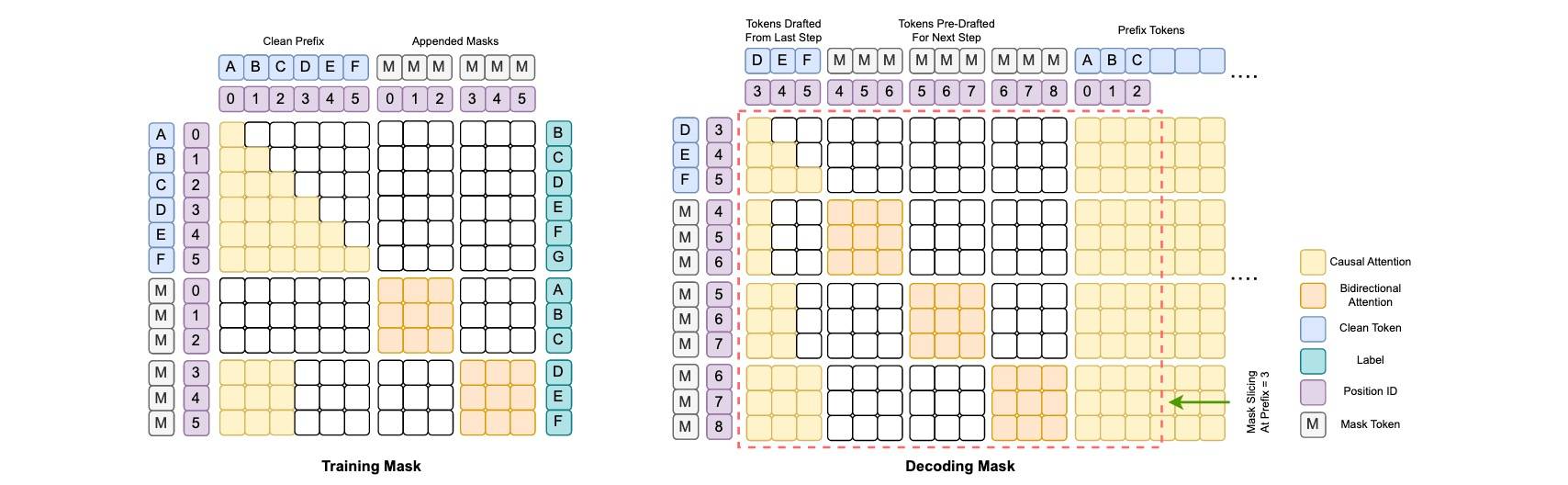 • 对于用于下一步扩散预生成的 mask token,采用块因果注意力,即块内双向块间因果的结构,实现单步扩散式的并行预草稿生成。