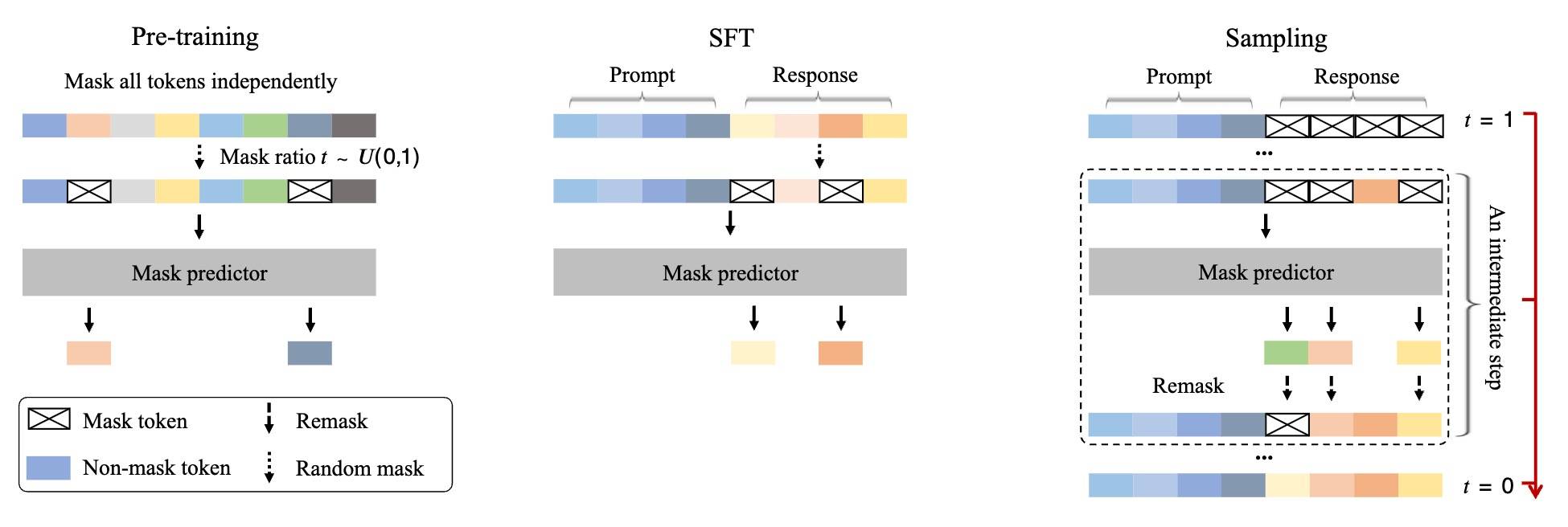• 前向过程中,序列中的 token 会被逐步、相互独立地随机 mask,t=1 时整条序列被完全 mask。