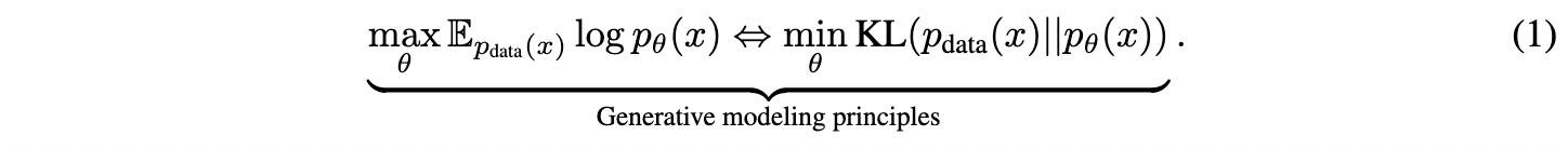 LLaDA 认为 scalability 主要来源于 Transformer 架构、模型规模、数据规模,以及生成式建模原则(下式)所诱导的 Fisher 一致性之间的相互作用,而非具体的建模方式(AR 只是其中一种)。