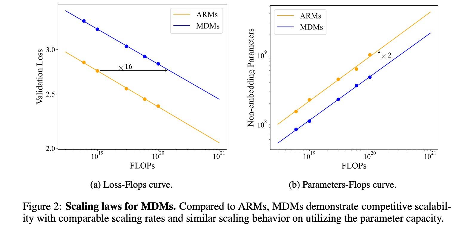 前面提到的三篇论文建立了 MDLM 的基础理论,依然是人大(有几个作者就是之前那篇论文的;D)的 2410 Scaling up Masked Diffusion Models on Text[13] 引入了 MDLM 的 Scaling Law,证明其扩展速度与自回归模型(ARM)相当,且计算量差距相对较小。