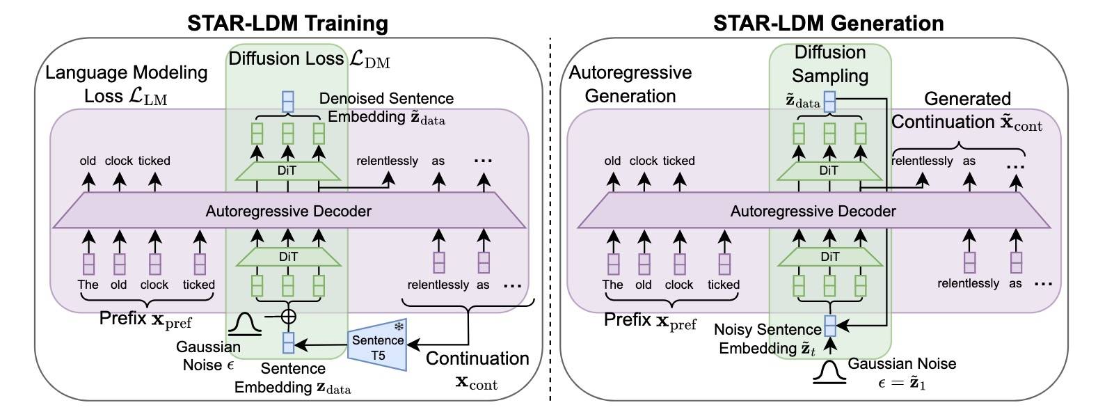 • continous 被 Sentence-T5 标准成 clean latent,然后加噪得到 zt = αt×Zdata + σt×ε,