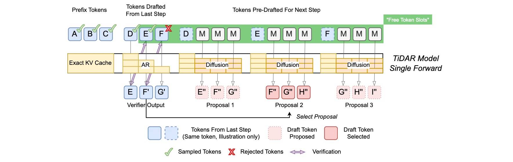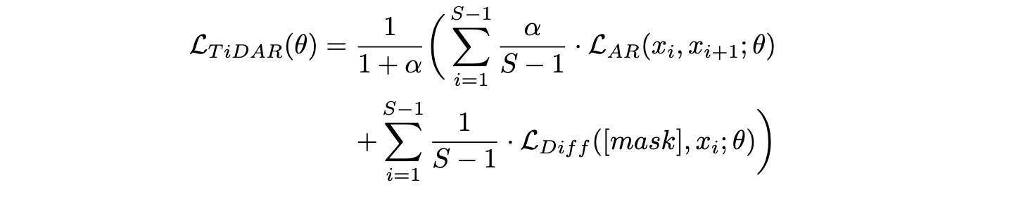 如果说上面的 Diffuse Thinking 看起来比较”硬“,那 NVIDIA 的《2511 TiDAR: Think in Diffusion, Talk in Autoregression[20]》就比较有意思了,它结合了 DLM 的并行生成潜力 + ARM 更好的生成质量,将两者统一到一个架构下:在扩散范式中进行 token 草稿生成,以自回归方式对最终输出进行(拒绝)采样。
